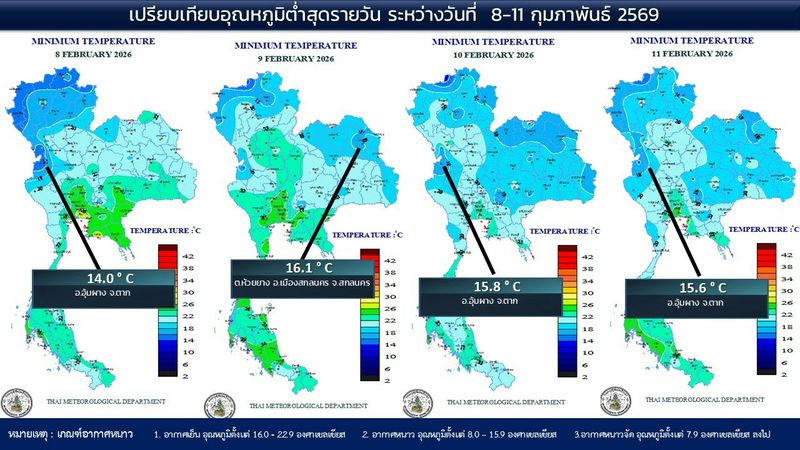 - 07:00 แผนที่เปรียบเทียบอุณหภูมิต่ำสุดในประเทศไทยรอบ 24 ชั่วโมงย้อนหลัง 4 วัน