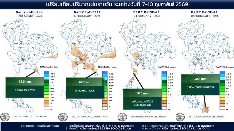 - 07:00 แผนที่เปรียบเทียบพื้นที่ที่มีปริมาณฝนสูงสุดในประเทศไทยรอบ 24 ชั่วโมงย้อนหลัง 4 วัน