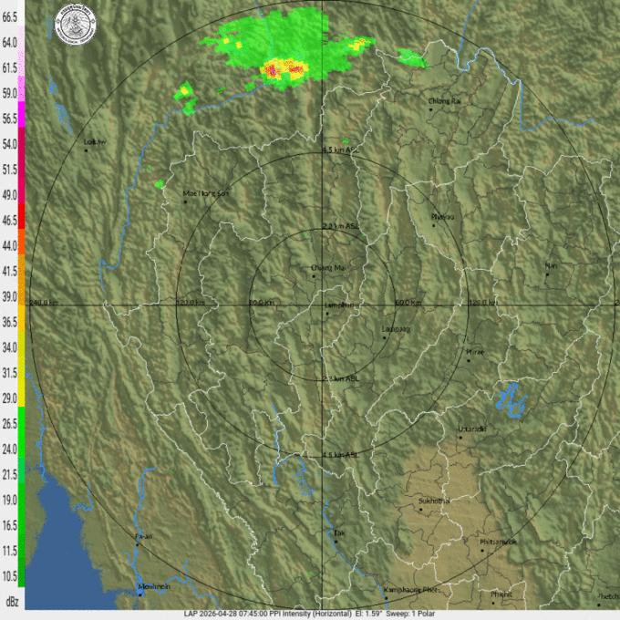 - 16:00 เรดาร์ตรวจอากาศ TMD แบบเคลื่อนไหว รัศมี 240 กม. ศูนย์กลางที่ จ.ลำพูน แสดงกลุ่มฝนตลอด 1 ชั่วโมง 15 นาที ที่ผ่านมา