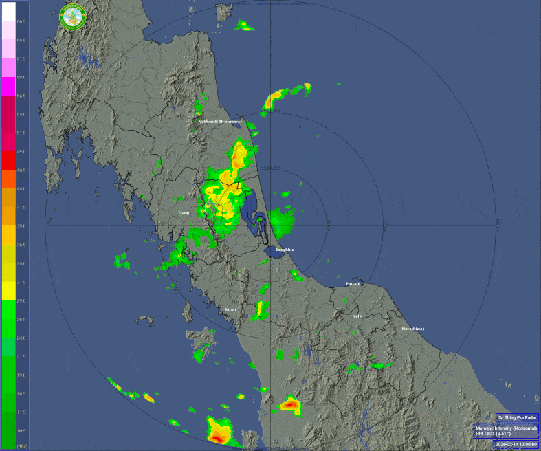 - 20:15 เรดาร์ตรวจอากาศ TMD แบบเคลื่อนไหว รัศมี 240 กม. ศูนย์กลางที่ สทิงพระ แสดงกลุ่มฝนตลอด 1 ชั่วโมง 15 นาที ที่ผ่านมา