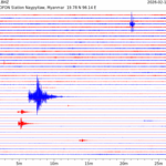 - 08:28 กราฟแผ่นดินไหว ช่วง 24 ชั่วโมงที่ผ่านมา บันทึกจากสถานีกรุงเนปิดอว์ ประเทศพม่า (กราฟนี้เน้นใช้ประโยชน์เรื่องของเวลาที่เกิดแผ่นดินไหว โดยแยกสีเป็นแดงน้ำเงินสีละครึ่งชั่วโมงเพื่อให้ดูง่าย ส่วนเรื่องขนาดแผ่นดินไหว กราฟนี้ไม่อาจใช้ระบุตัวเลขที่ชัดเจน)