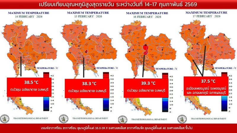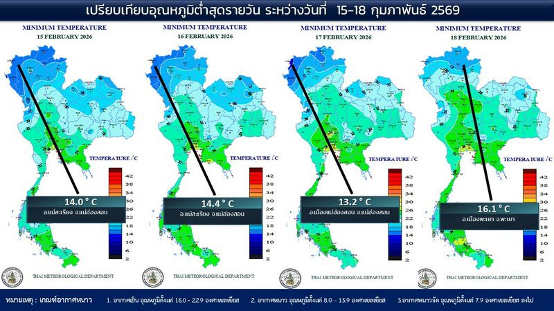 - 07:00 แผนที่เปรียบเทียบอุณหภูมิต่ำสุดในประเทศไทยรอบ 24 ชั่วโมงย้อนหลัง 4 วัน