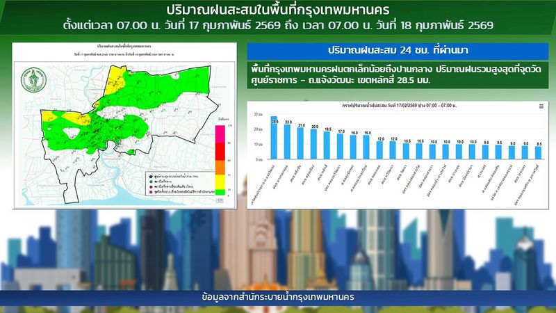- 07:00 แผนที่เปรียบเทียบปริมาณและบริเวณที่ฝนตกย้อนหลัง 24 ชั่วโมงในกรุงเทพมหานครข้อมูลจากสำนักป้องกันน้ำท่วม กทม.
