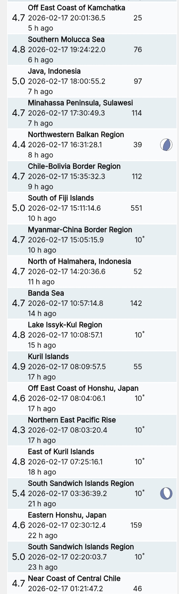 สรุปรายการแผ่นดินไหวและอาฟเตอร์ช็อกทั่วโลกจาก Geofon เยอรมนี ช่วง 07:00 เมื่อวานนี้ ถึง 07:00 เช้าวันนี้ (เวลาในตารางเป็น UTC ต้องบวก 7 ชั่วโมงให้เป็นเวลาไทย)
