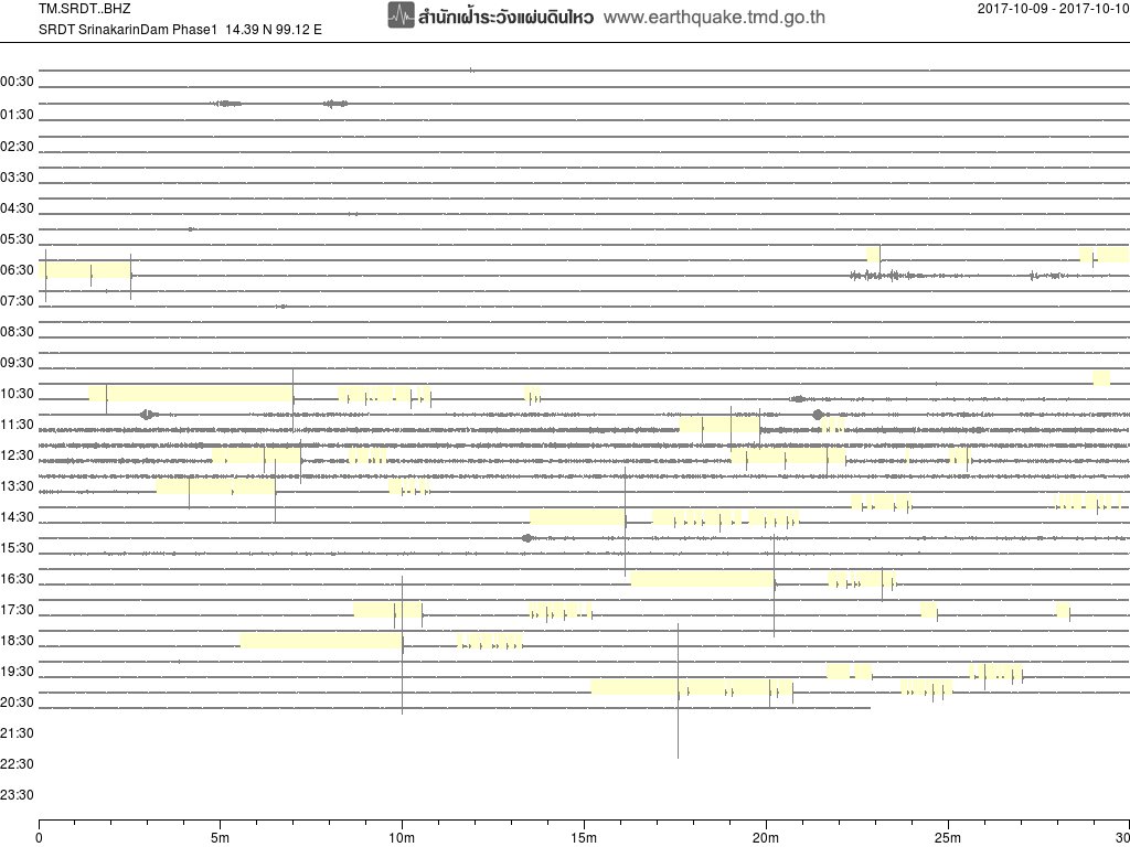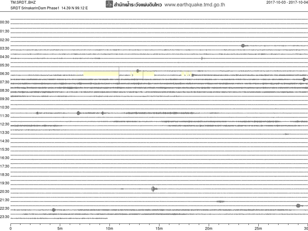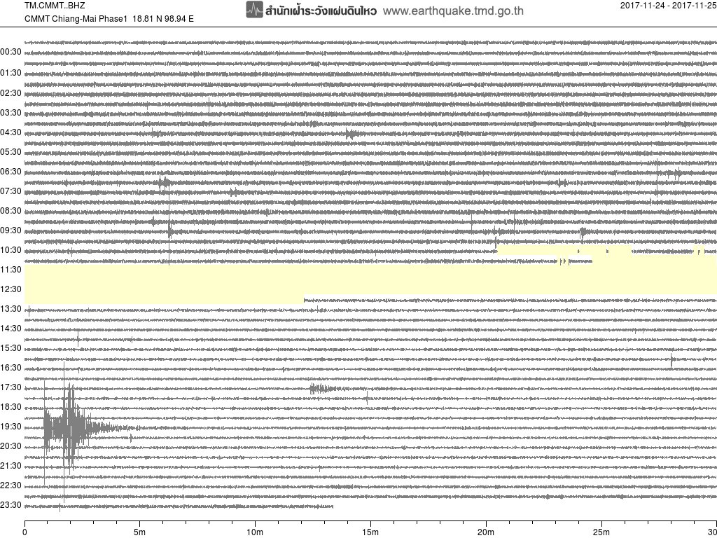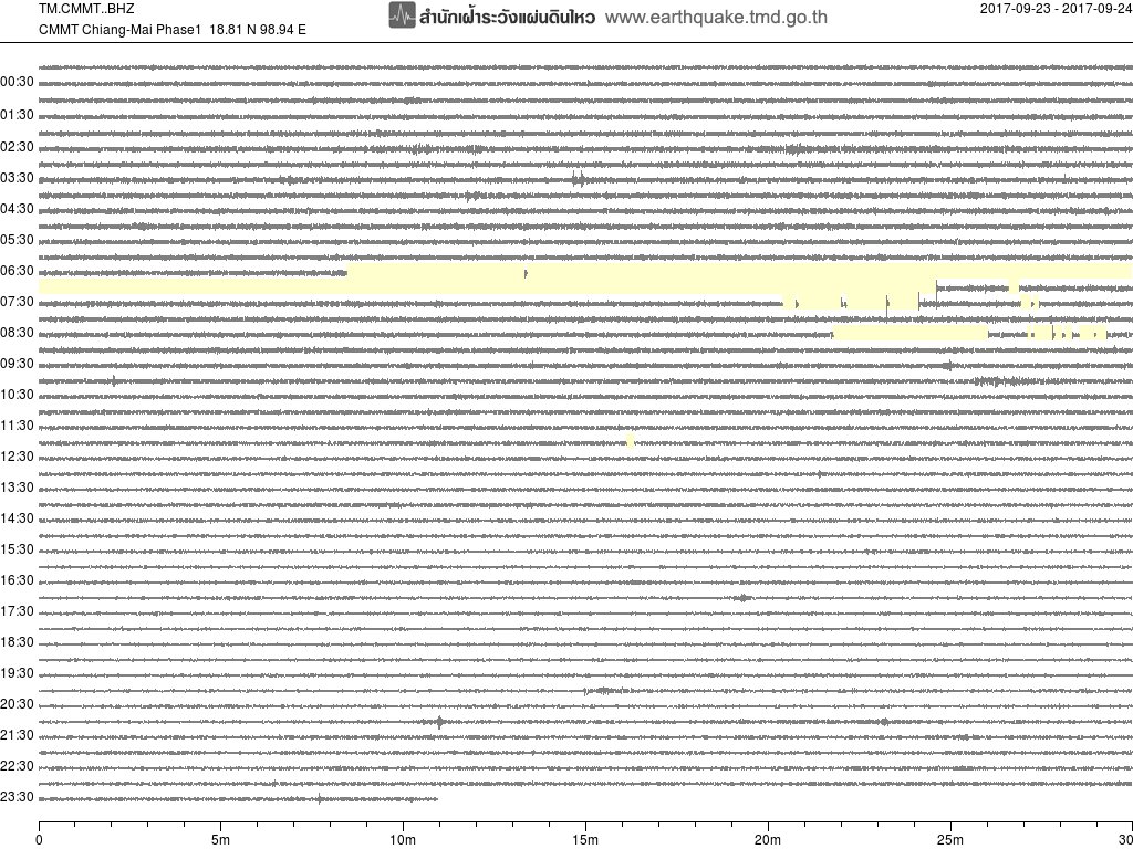 - กราฟแผ่นดินไหวจากสถานี สถานี CMMT เชียงใหม่ ของสำนักเฝ้าระวังฯ กรมอุตุฯ จากเวลา 07:00 เมื่อวานนี้ถึง 07:00 เช้านี้