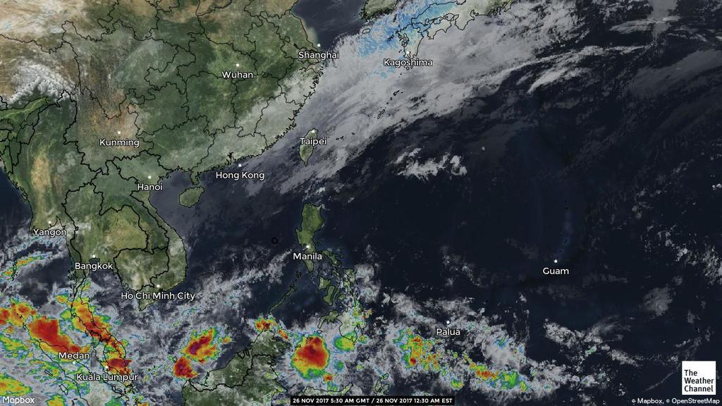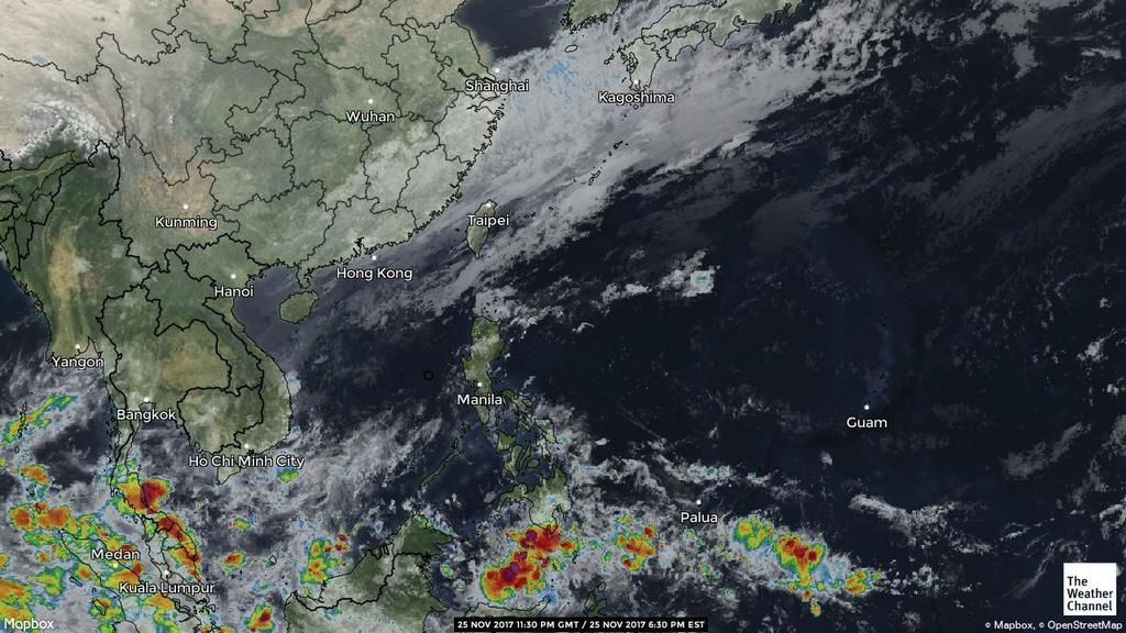 - 16:00 กลุ่มฝนที่ถล่มภาคใต้พัฒนาเป็นหย่อมความกดอากาศต่ำ 93W ศูนย์กลางอยู่ที่พิกัด 4.2°N 106.7°E ความเร็วลม 15 น็อต ความกดอากาศ 1007 hPa ก่อร่องฝนพาดไปทางมาเลเซีย แนวโน้มจะเคลื่อนข้ามฝั่งไปพัฒนาเป็นพายุในทะเลอันดามัน