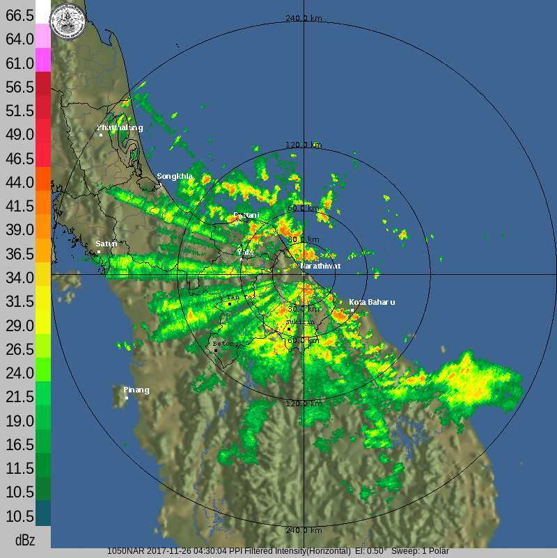 - 00:04 กลุ่มฝนจากอ่าวไทยเคลื่อนตัวเข้ามาตกใน จ.นราธิวาส ปัตตานี ต่อเนื่องยะลา ดูภาพเรดาร์