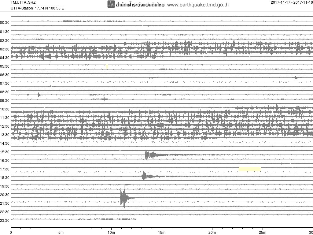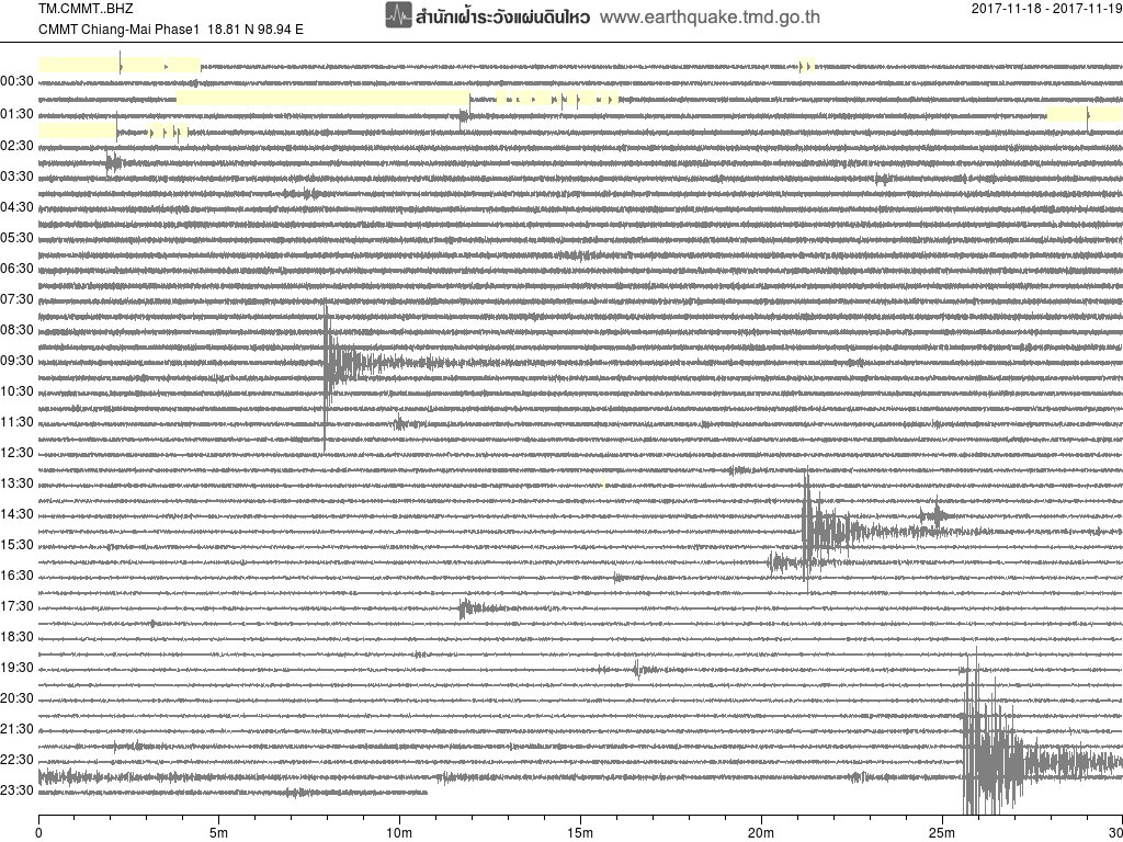 - กราฟแผ่นดินไหวจากสถานี CMMT เชียงใหม่ ของสำนักเฝ้าระวังฯ กรมอุตุฯ จากเวลา 07:00 เมื่อวานนี้ถึง 07:00 เช้านี้