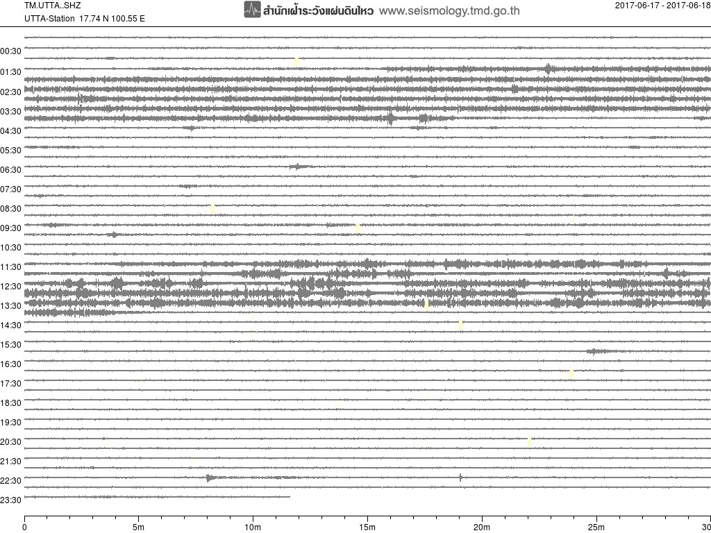 - กราฟแผ่นดินไหวจากสถานี เขื่อนสิริกิติ์ จ.อุตรดิตถ์ ของกรมอุตุจากเวลา 07:00 เมื่อวานนี้ถึง 07:00 เช้านี้
