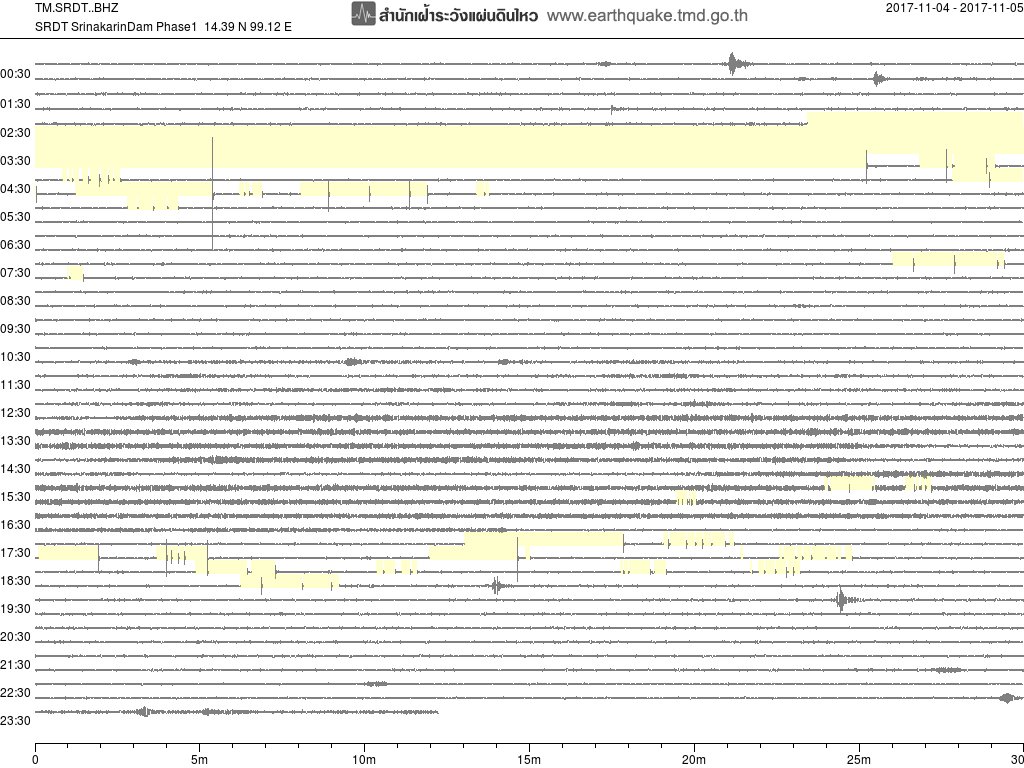 - กราฟแผ่นดินไหวจากสถานี สถานี SRDT เขื่อนศรีนครินทร์ ของสำนักเฝ้าระวังฯ กรมอุตุฯ จากเวลา 07:00 เมื่อวานนี้ถึง 07:00 เช้านี้