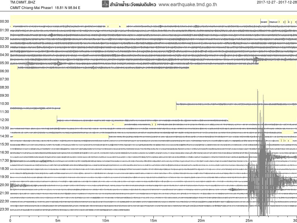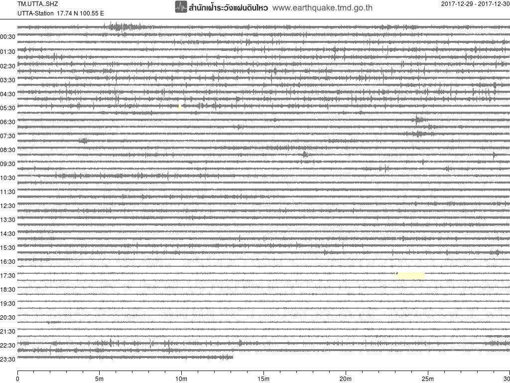 - กราฟแผ่นดินไหวจากสถานี เขื่อนสิริกิติ์ จ.อุตรดิตถ์ UTTA ของสำนักเฝ้าระวังฯ กรมอุตุฯ จากเวลา 07:00 เมื่อวานนี้ถึง 07:00 เช้านี้