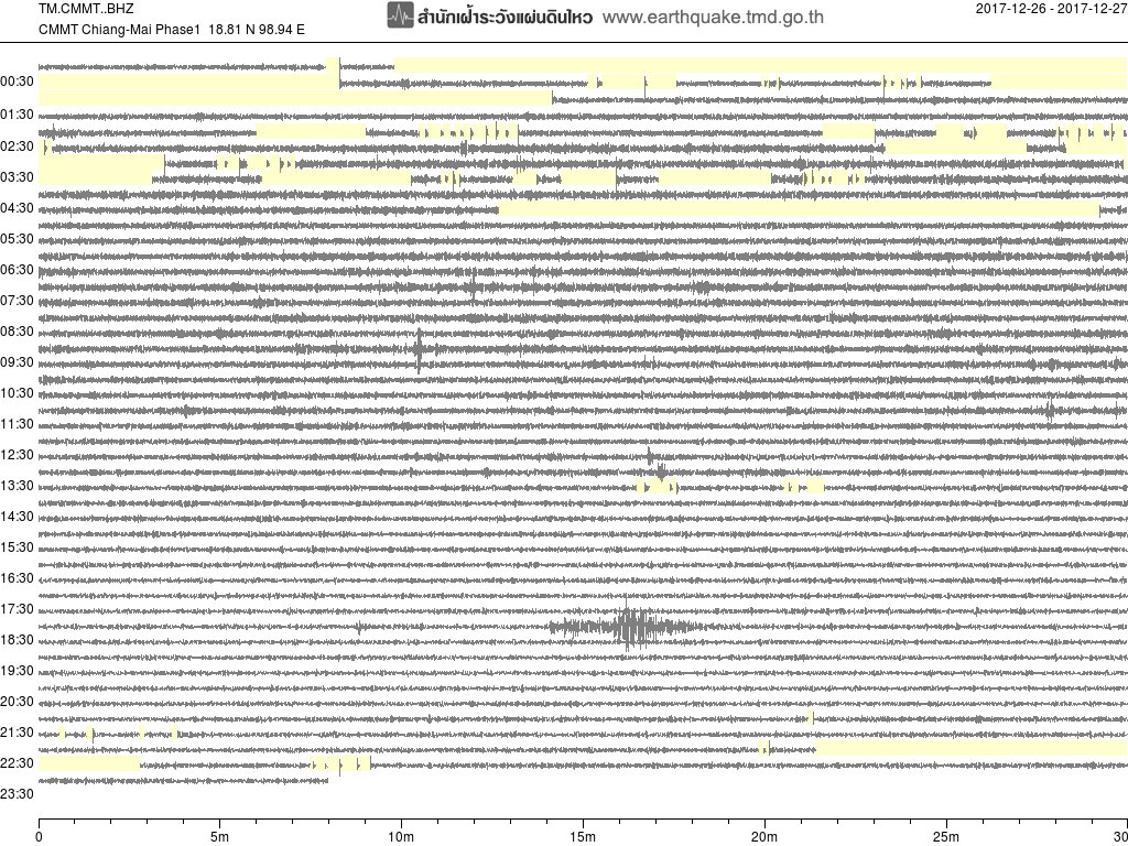 - กราฟแผ่นดินไหวจากสถานี สถานี CMMT เชียงใหม่ ของสำนักเฝ้าระวังฯ กรมอุตุฯ จากเวลา 07:00 เมื่อวานนี้ถึง 07:00 เช้านี้