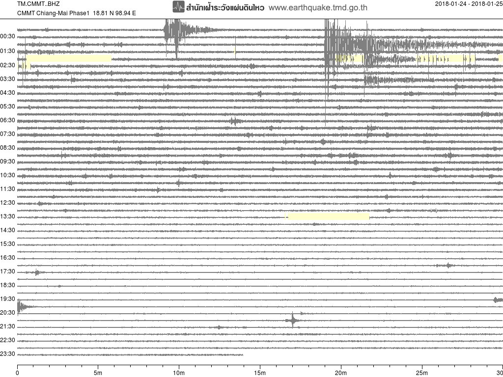 - กราฟแผ่นดินไหวจากสถานี CMMT เชียงใหม่ ของสำนักเฝ้าระวังฯ กรมอุตุฯ จากเวลา 07:00 เมื่อวานนี้ถึง 07:00 เช้านี้