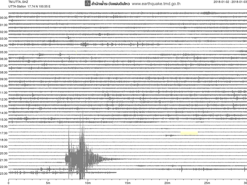 - กราฟแผ่นดินไหวจากสถานี สถานี เขื่อนสิริกิติ์ จ.อุตรดิตถ์ UTTA ของสำนักเฝ้าระวังฯ กรมอุตุฯ จากเวลา 07:00 เมื่อวานนี้ถึง 07:00 เช้านี้