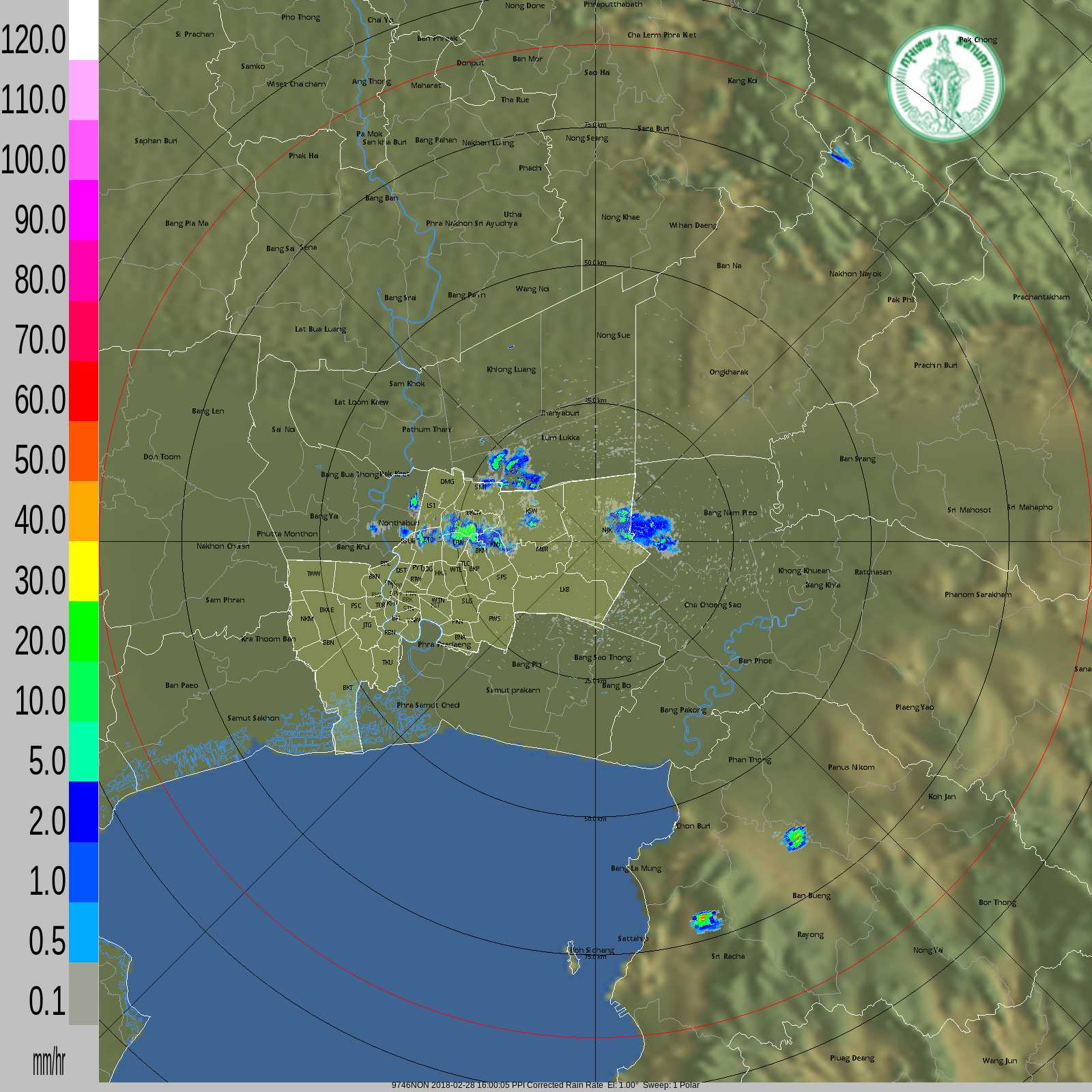 - 16:40 ฝนปานกลางลุ่มเล็กฝนเคลื่อนตัวจาก กรุงเทพ เข้า อ.เมืองนนทบุรี อ.ปากเกร็ด บางส่วนอยู่ในเขตหลักสี่ บางเขน ดอนเมือง สายไหม