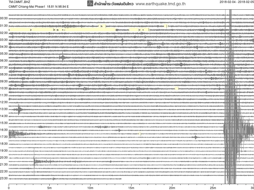 - กราฟแผ่นดินไหวจากสถานี CMMT เชียงใหม่ ของสำนักเฝ้าระวังฯ กรมอุตุฯ จากเวลา 07:00 เมื่อวานนี้ถึง 07:00 เช้านี้