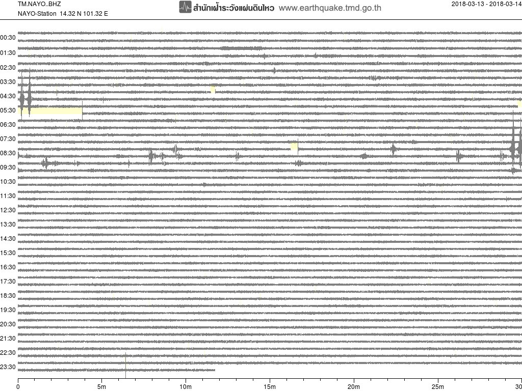 - กราฟแผ่นดินไหวจากสถานี CMMT เชียงใหม่ ของสำนักเฝ้าระวังฯ กรมอุตุฯ จากเวลา 07:00 เมื่อวานนี้ถึง 07:00 เช้านี้