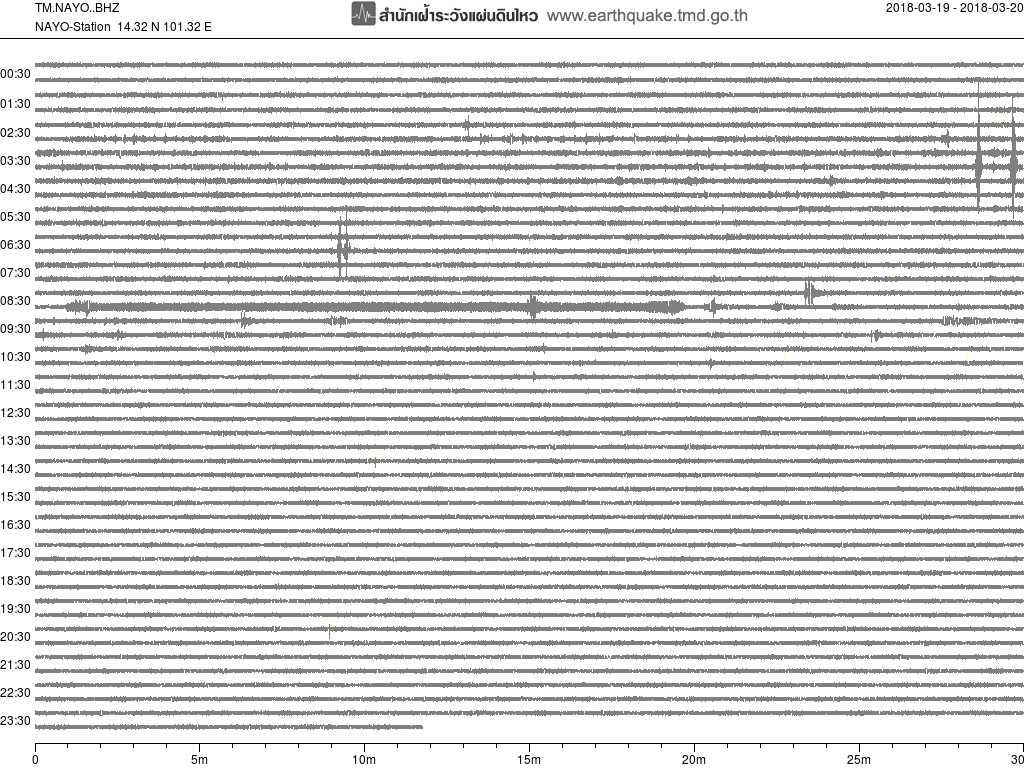 - กราฟแผ่นดินไหวจากสถานี นครนายก ของสำนักเฝ้าระวังฯ กรมอุตุฯ จากเวลา 07:00 เมื่อวานนี้ถึง 07:00 เช้านี้