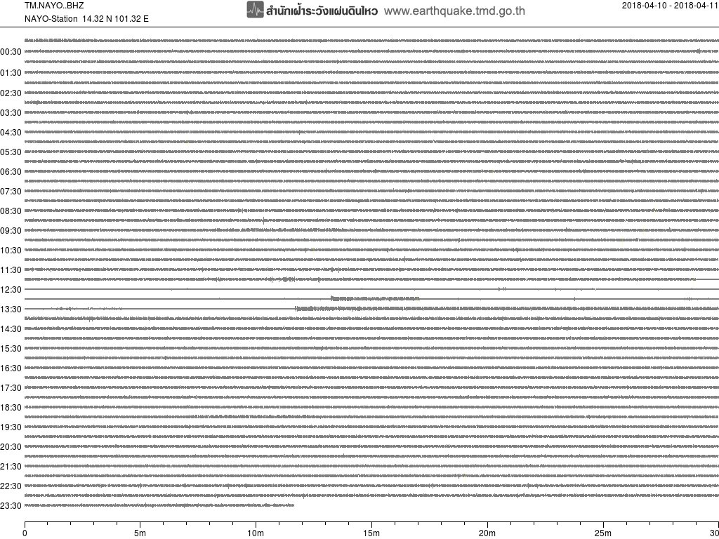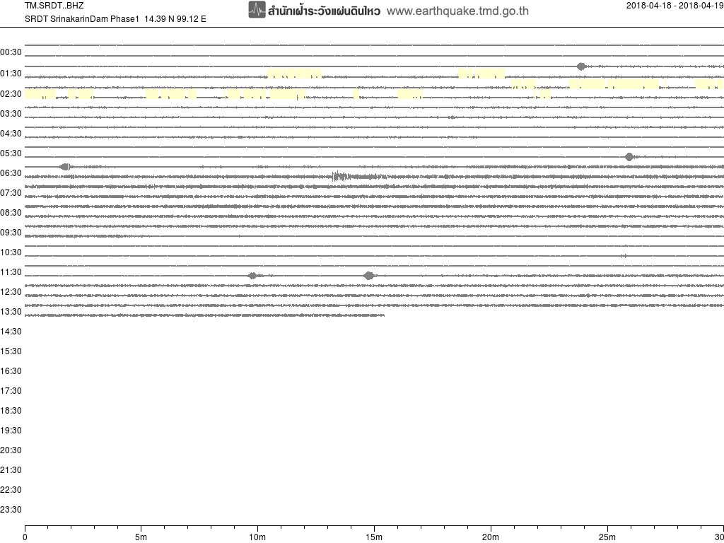- กราฟแผ่นดินไหวจากสถานี SRDT เขื่อนศรีนครินทร์ ของสำนักเฝ้าระวังฯ กรมอุตุฯ จากเวลา 07:00 เมื่อวานนี้ถึง 07:00 เช้านี้