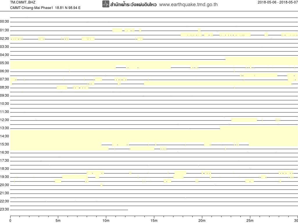 - กราฟแผ่นดินไหวจากสถานี นครนายก ของสำนักเฝ้าระวังฯ กรมอุตุฯ จากเวลา 07:00 เมื่อวานนี้ถึง 07:00 เช้านี้