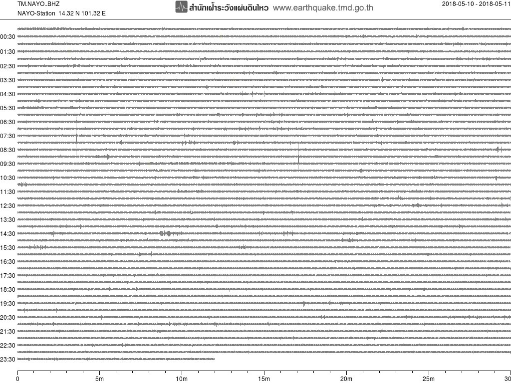 • กราฟแผ่นดินไหวจากสถานี นครนายก ของสำนักเฝ้าระวังฯ กรมอุตุฯ จากเวลา 07:00 เมื่อวานนี้ถึง 07:00 เช้านี้