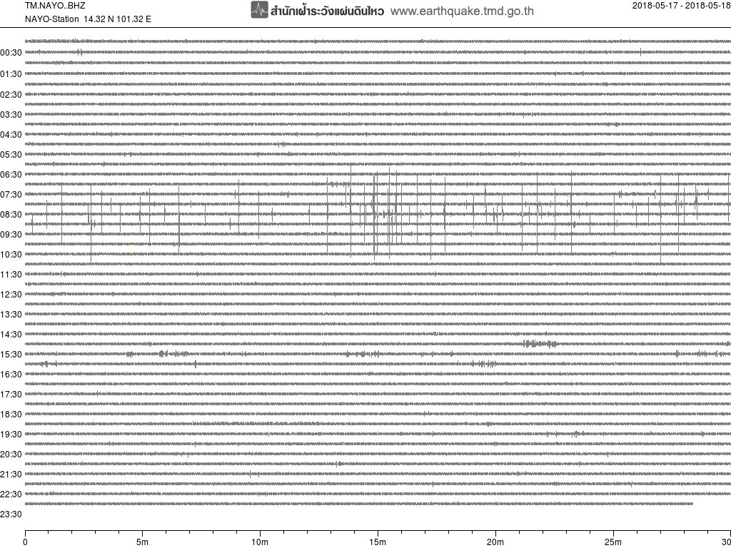 - กราฟแผ่นดินไหวจากสถานี นครนายก ของสำนักเฝ้าระวังฯ กรมอุตุฯ จากเวลา 07:00 เมื่อวานนี้ถึง 07:00 เช้านี้