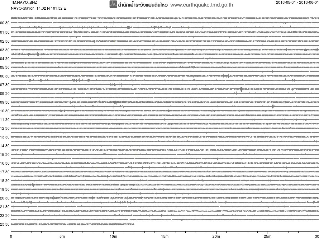 - กราฟแผ่นดินไหวจากสถานี นครนายก ของสำนักเฝ้าระวังฯ กรมอุตุฯ จากเวลา 07:00 เมื่อวานนี้ถึง 07:00 เช้านี้