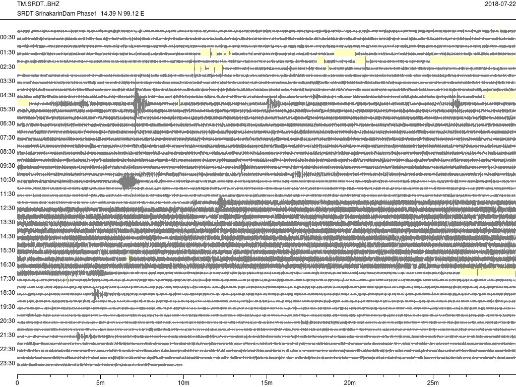 - กราฟแผ่นดินไหวจากสถานี SRDT เขื่อนศรีนครินทร์ ของสำนักเฝ้าระวังฯ กรมอุตุฯ จากเวลา 07:00 เมื่อวานนี้ถึง 07:00 เช้านี้