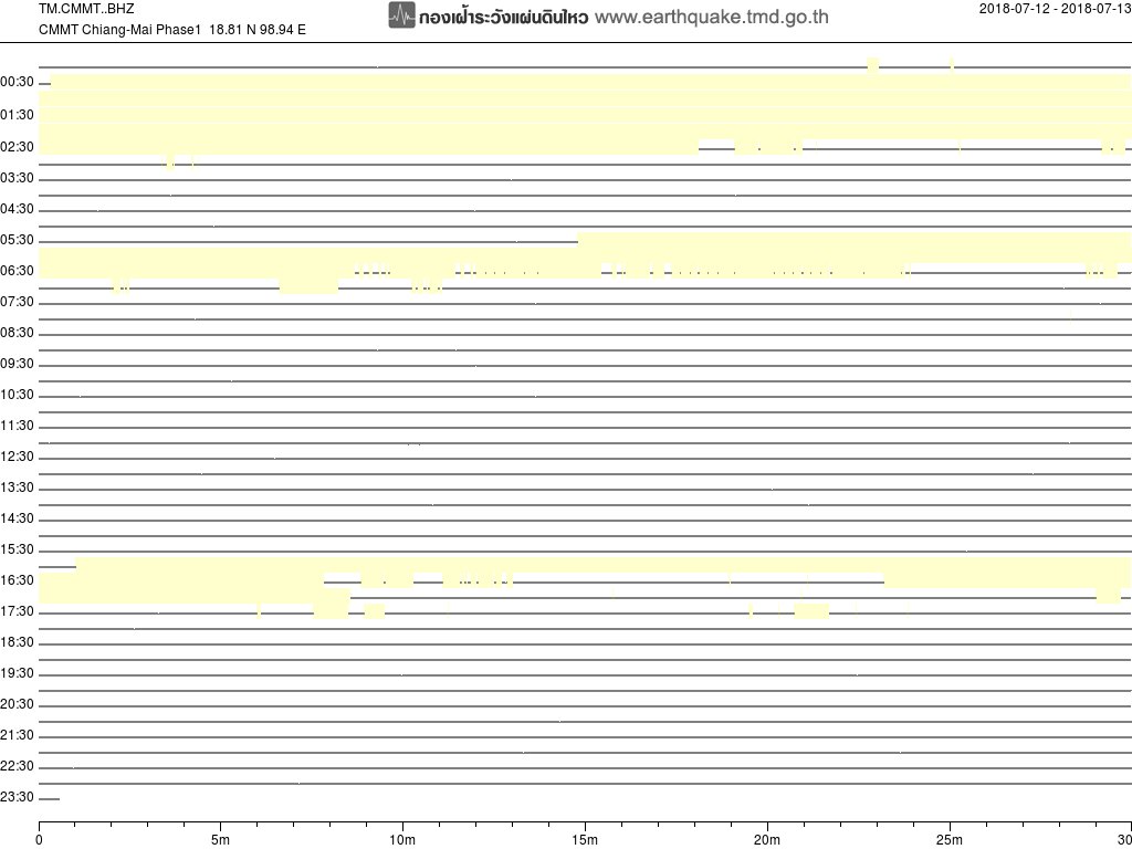 - กราฟแผ่นดินไหวจากสถานี SRDT เขื่อนศรีนครินทร์ ของสำนักเฝ้าระวังฯ กรมอุตุฯ จากเวลา 07:00 เมื่อวานนี้ถึง 07:00 เช้านี้