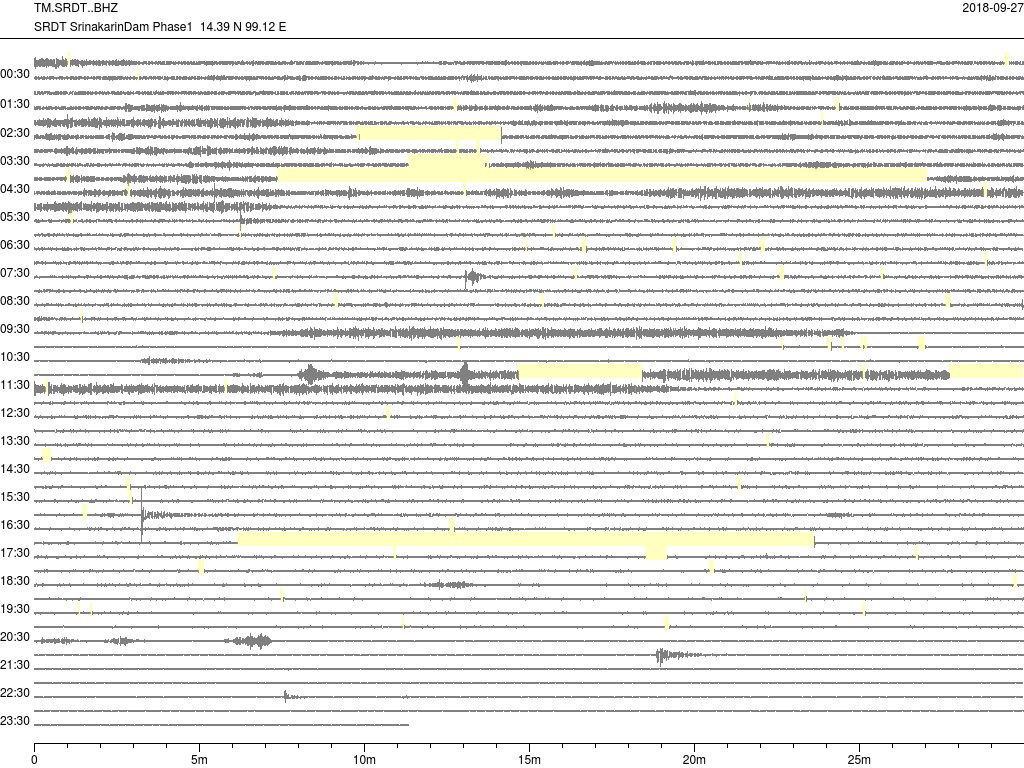 - กราฟแผ่นดินไหวจากสถานี SRDT เขื่อนศรีนครินทร์ ของสำนักเฝ้าระวังฯ กรมอุตุฯ จากเวลา 07:00 เมื่อวานนี้ถึง 07:00 เช้านี้