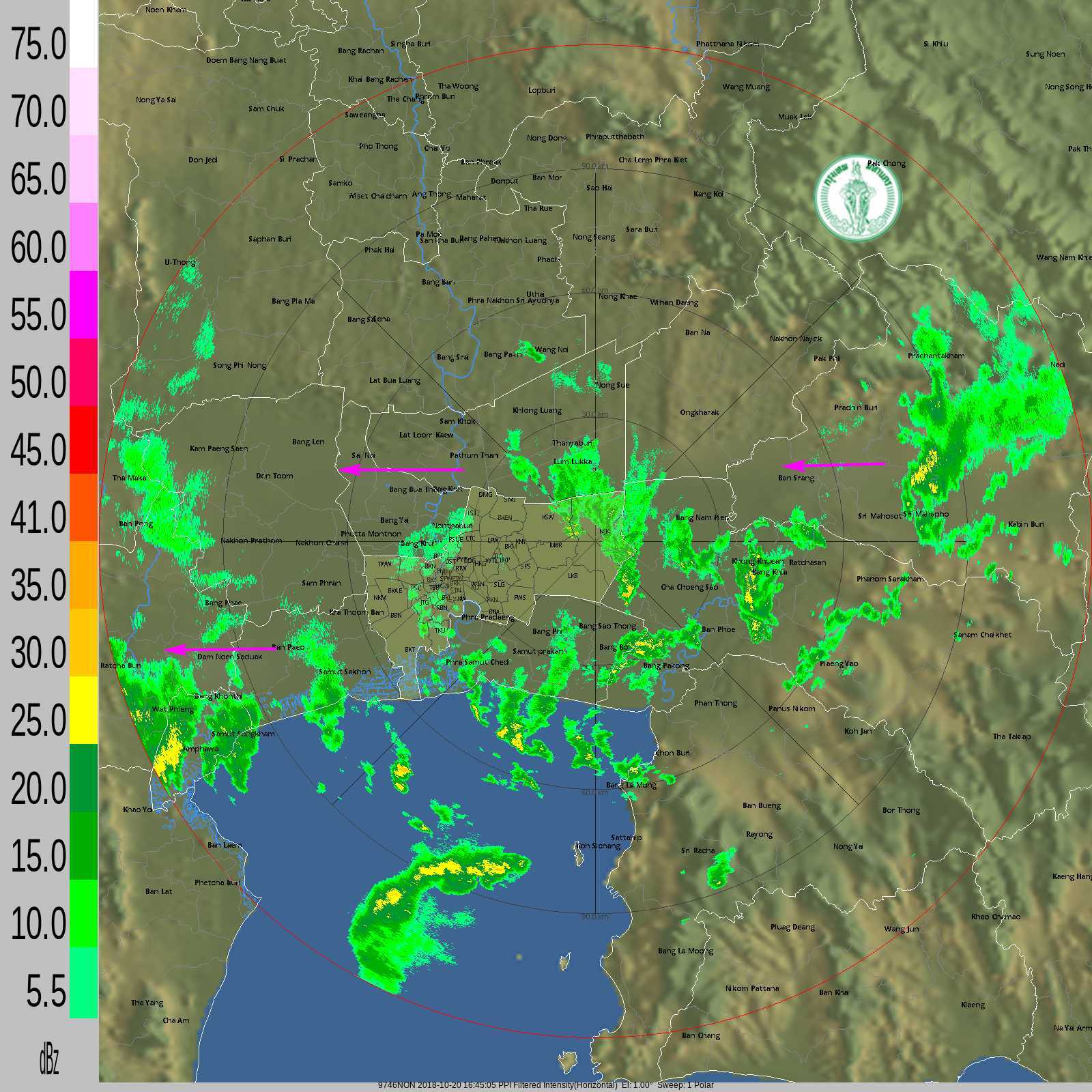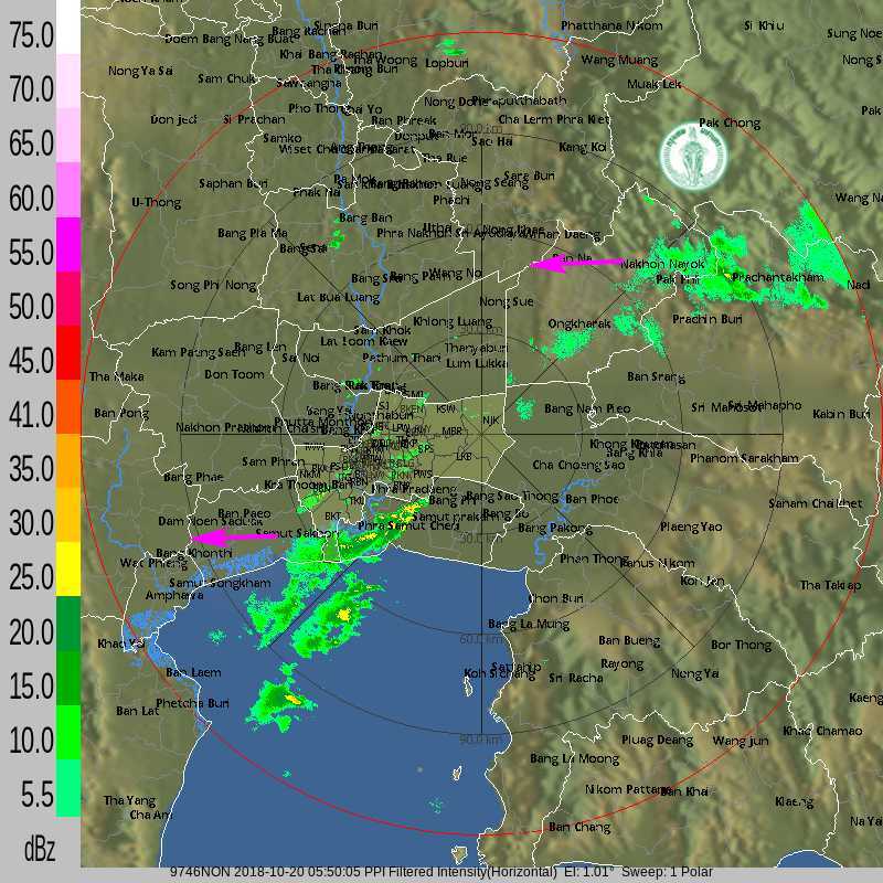 - 01:50 กลุ่มฝนหนักเคลื่อนจากอ่าวไทยเข้าสมุทรสงคราม สมุทรสาคร