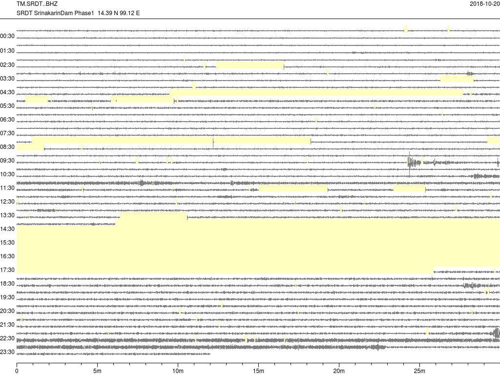 - กราฟแผ่นดินไหวจากสถานี SRDT เขื่อนศรีนครินทร์ ของสำนักเฝ้าระวังฯ กรมอุตุฯ จากเวลา 07:00 เมื่อวานนี้ถึง 07:00 เช้านี้
