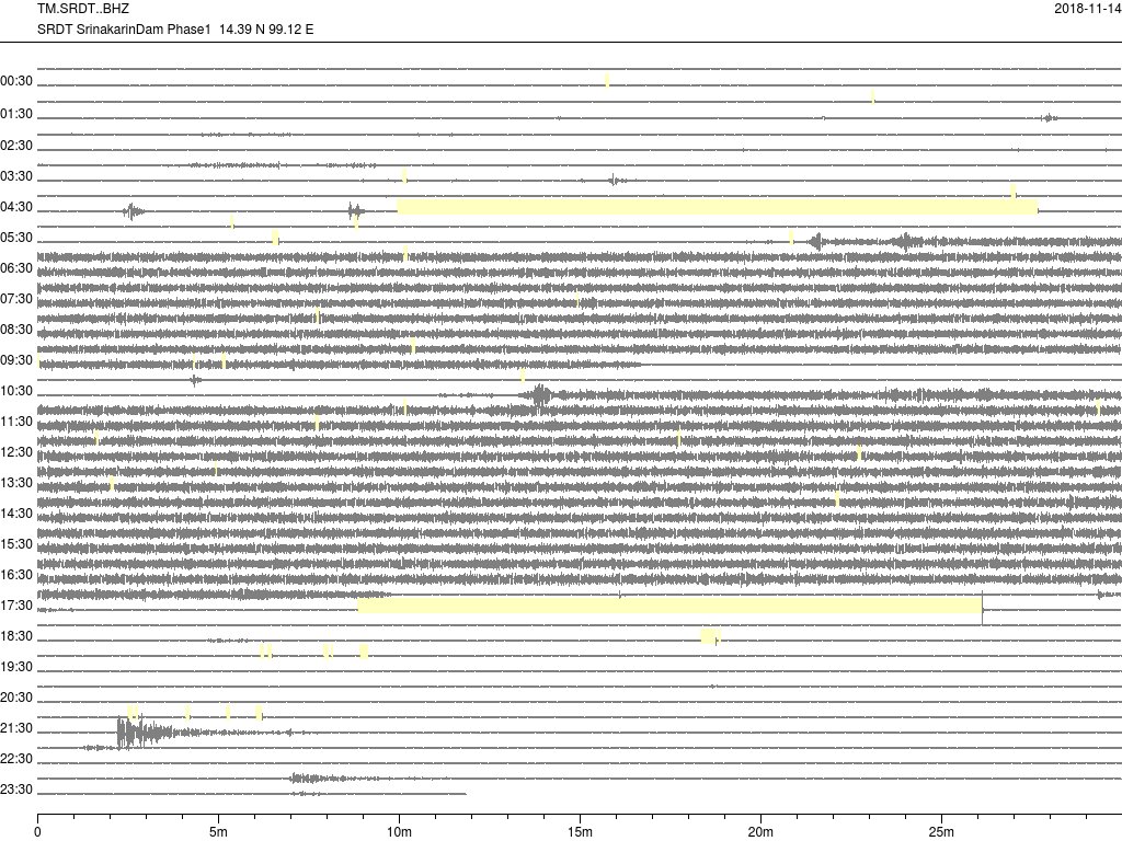 - กราฟแผ่นดินไหวจากสถานี SRDT เขื่อนศรีนครินทร์ ของสำนักเฝ้าระวังฯ กรมอุตุฯ จากเวลา 07:00 เมื่อวานนี้ถึง 07:00 เช้านี้