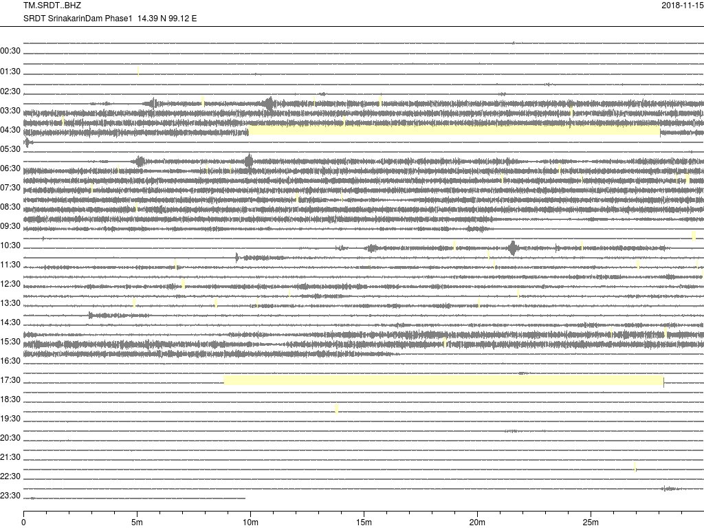- กราฟแผ่นดินไหวจากสถานี SRDT เขื่อนศรีนครินทร์ ของสำนักเฝ้าระวังฯ กรมอุตุฯ จากเวลา 07:00 เมื่อวานนี้ถึง 07:00 เช้านี้
