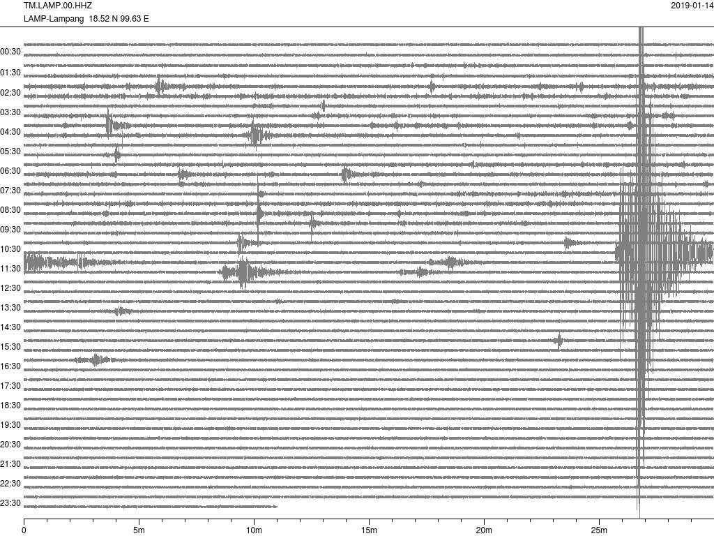 - กราฟแผ่นดินไหวจากสถานี เขื่อนกิ่วลม จ.ลำปาง (LAMP) ของสำนักเฝ้าระวังฯ กรมอุตุฯ จากเวลา 07:00 เมื่อวานนี้ถึง 07:00 เช้านี้
