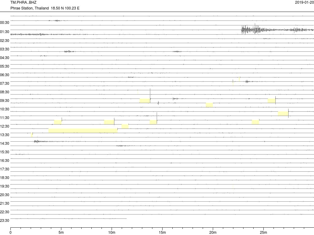 - กราฟแผ่นดินไหวจากสถานี อ่างเก็บน้ำสอง จ.แพร่ (PHRA)ของสำนักเฝ้าระวังฯ กรมอุตุฯ จากเวลา 07:00 เมื่อวานนี้ถึง 07:00 เช้านี้