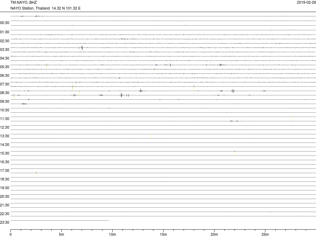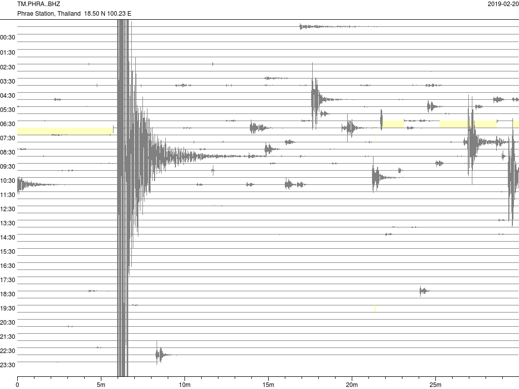 - กราฟแผ่นดินไหวจากสถานี จ.สุราษฎร์ธานี (SURT) ของสำนักเฝ้าระวังฯ กรมอุตุฯ จากเวลา 07:00 เมื่อวานนี้ถึง 07:00 เช้านี้