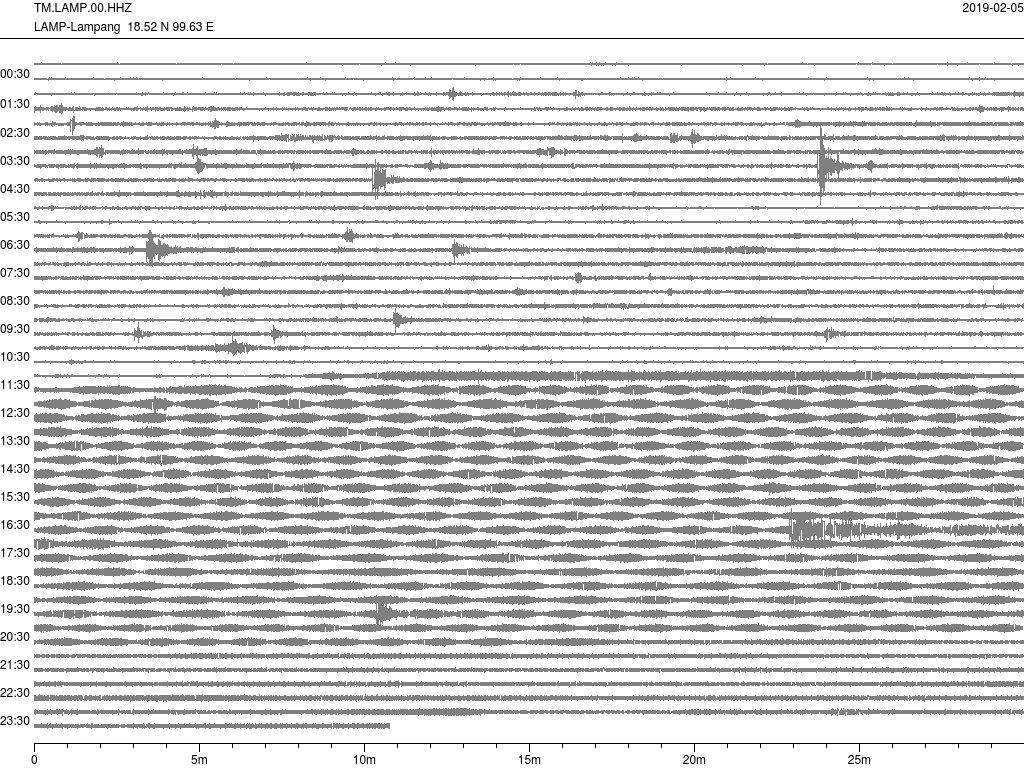 - กราฟแผ่นดินไหวจากสถานี เขื่อนกิ่วลม จ.ลำปาง (LAMP) ของสำนักเฝ้าระวังฯ กรมอุตุฯ จากเวลา 07:00 เมื่อวานนี้ถึง 07:00 เช้านี้