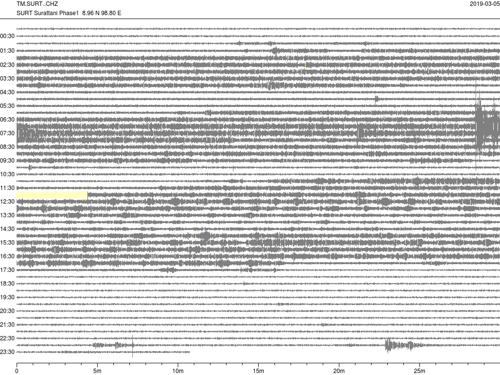 - กราฟแผ่นดินไหวจากสถานี จ.สุราษฎร์ธานี (SURT) ของสำนักเฝ้าระวังฯ กรมอุตุฯ จากเวลา 07:00 เมื่อวานนี้ถึง 07:00 เช้านี้