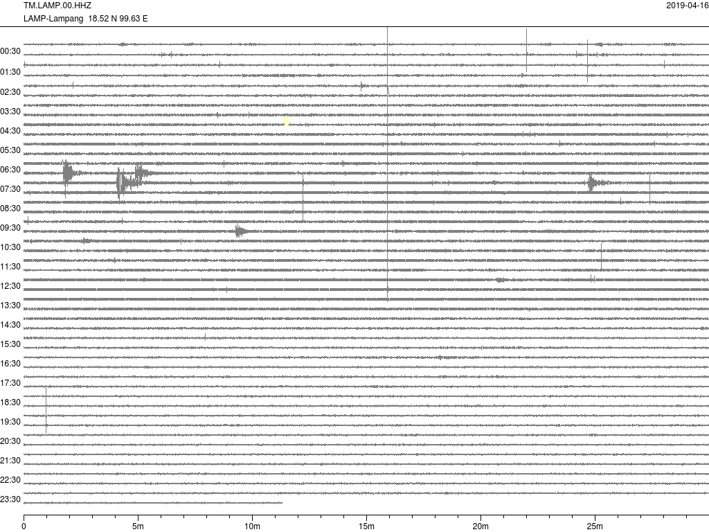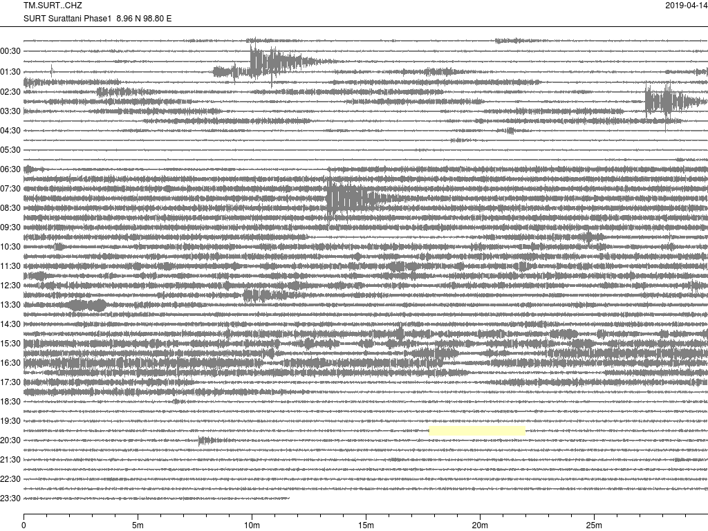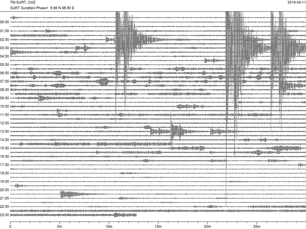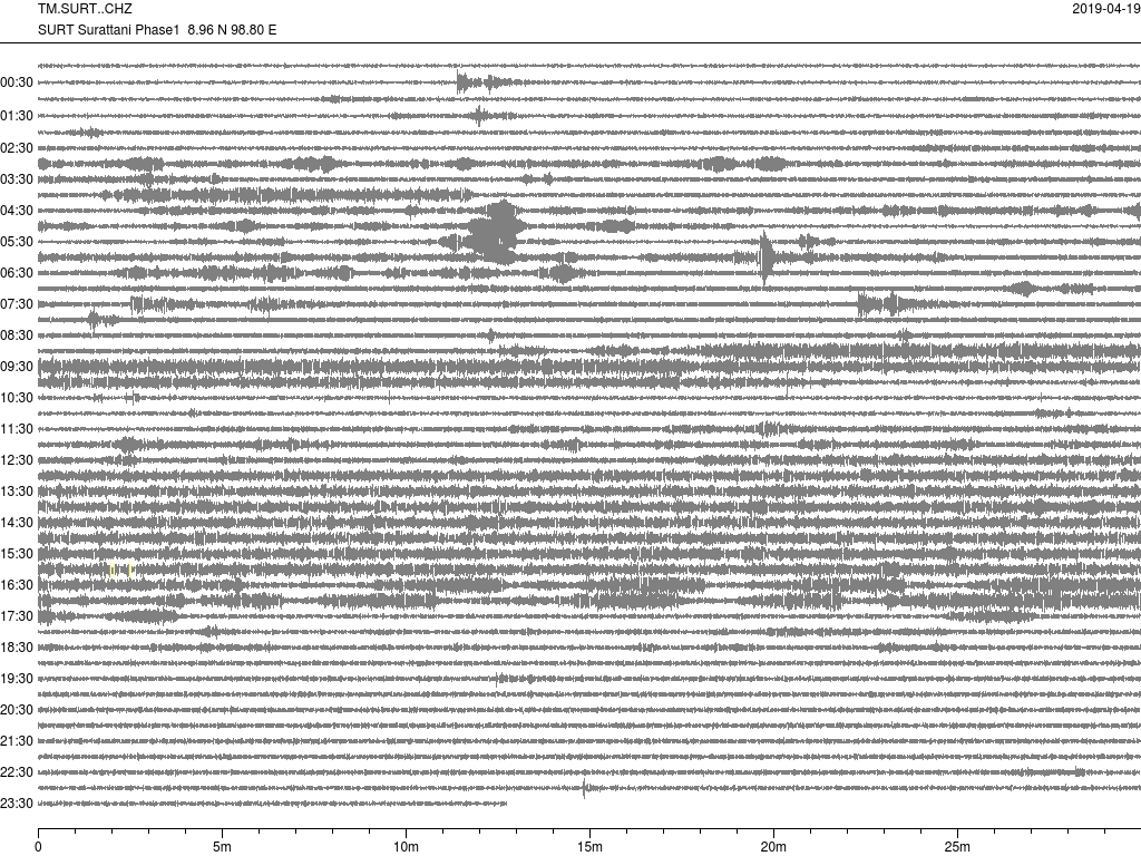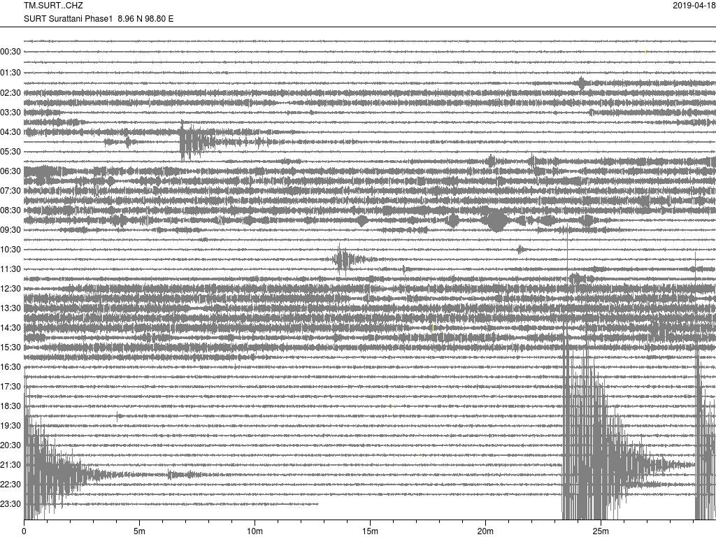 - กราฟแผ่นดินไหวจากสถานี จ.สุราษฎ์ธานี (SURT) ของสำนักเฝ้าระวังฯ กรมอุตุฯ จากเวลา 07:00 เมื่อวานนี้ถึง 07:00 เช้านี้