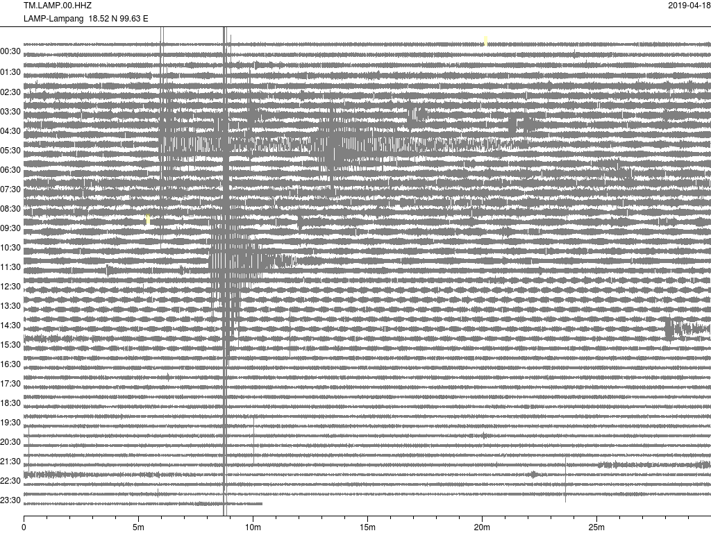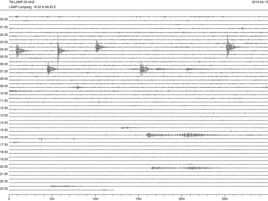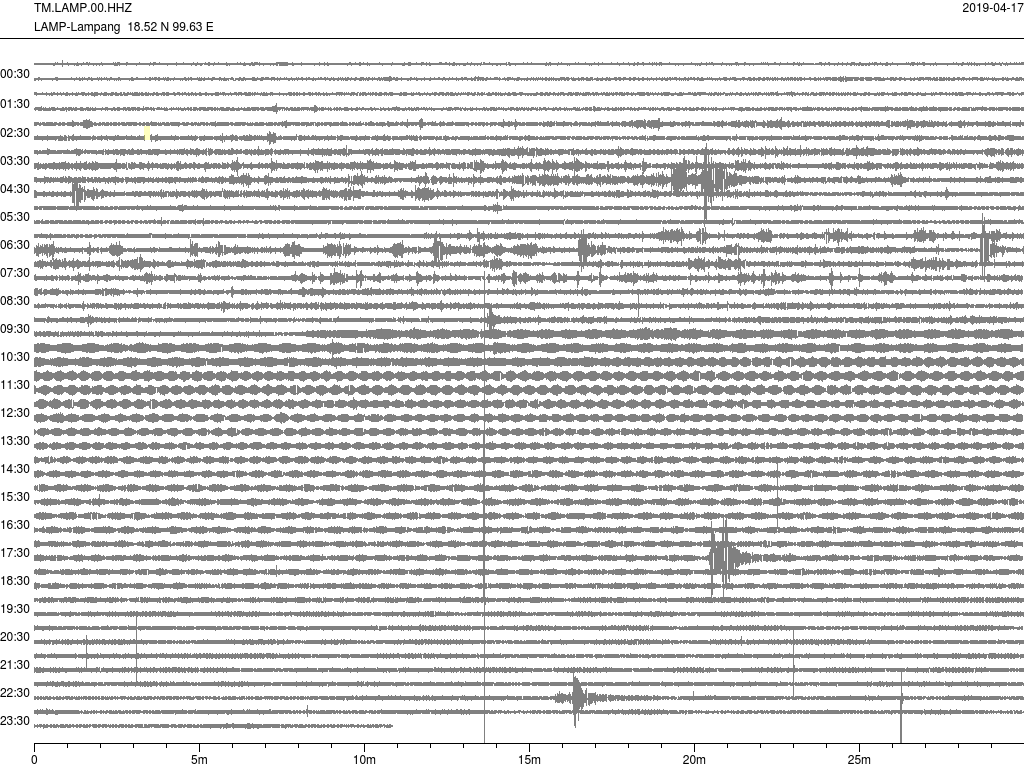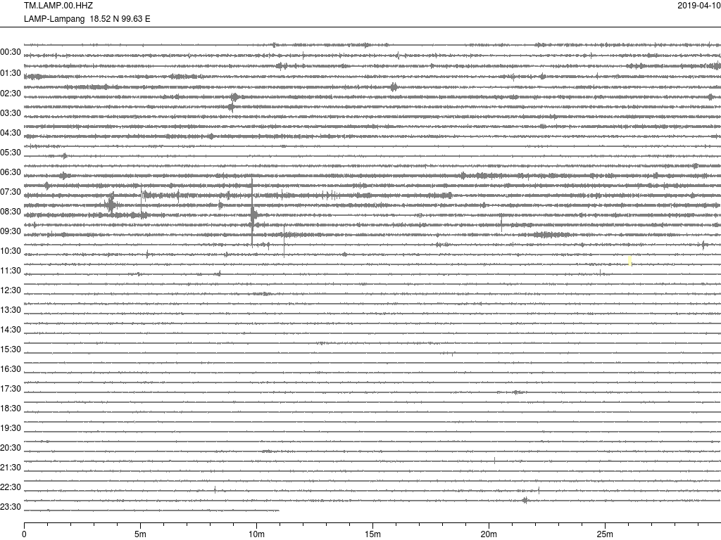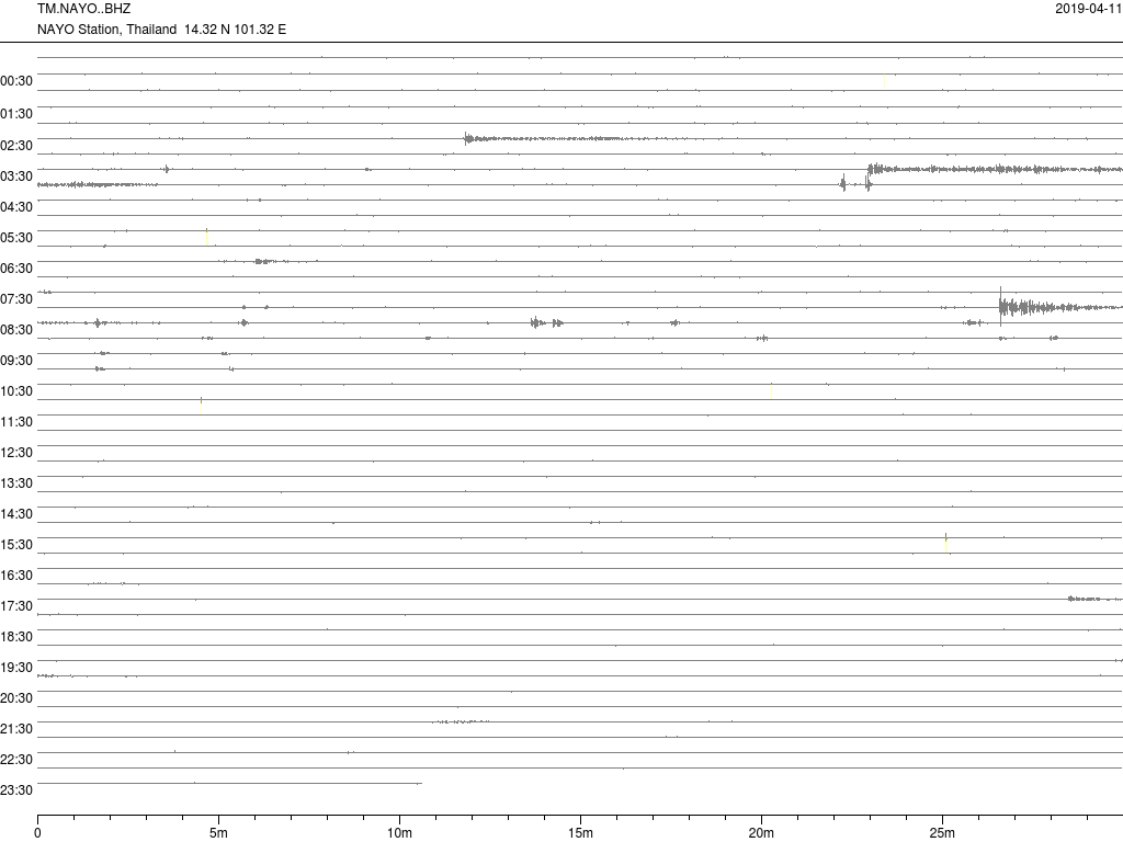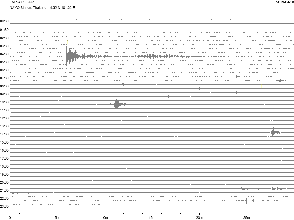 - กราฟแผ่นดินไหวจากสถานี จ.สุราษฎ์ธานี (SURT) ของสำนักเฝ้าระวังฯ กรมอุตุฯ จากเวลา 07:00 เมื่อวานนี้ถึง 07:00 เช้านี้