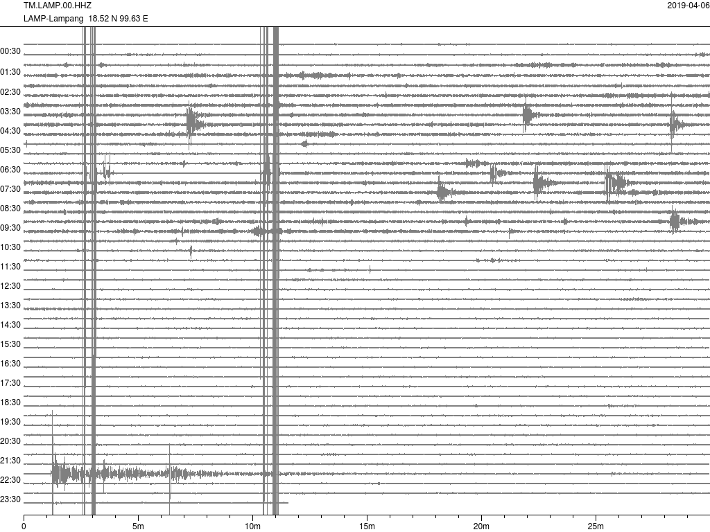 - กราฟแผ่นดินไหวจากสถานีเขื่อนกิ่วลม จ.ลำปาง (LAMP) ของสำนักเฝ้าระวังฯ กรมอุตุฯ จากเวลา 07:00 เมื่อวานนี้ถึง 07:00 เช้านี้