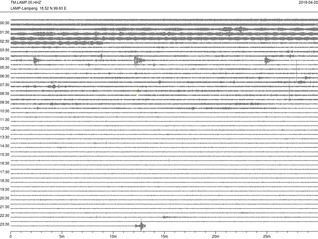- กราฟแผ่นดินไหวจากสถานีเขื่อนกิ่วลม จ.ลำปาง (LAMP) ของสำนักเฝ้าระวังฯ กรมอุตุฯ จากเวลา 07:00 เมื่อวานนี้ถึง 07:00 เช้านี้