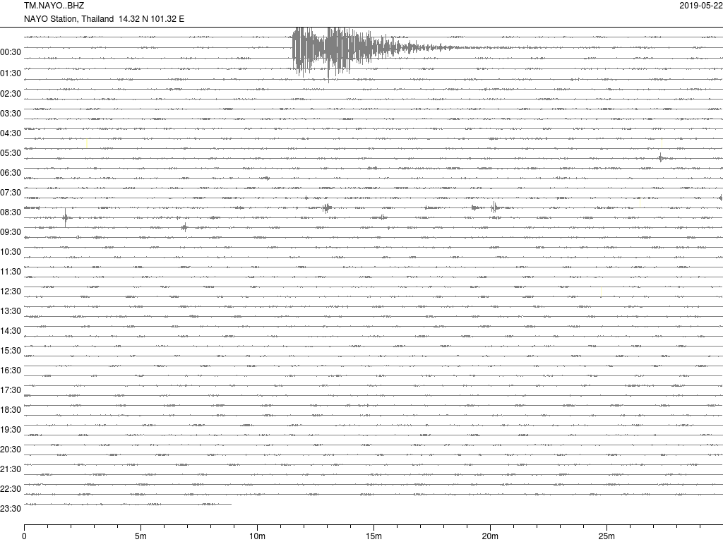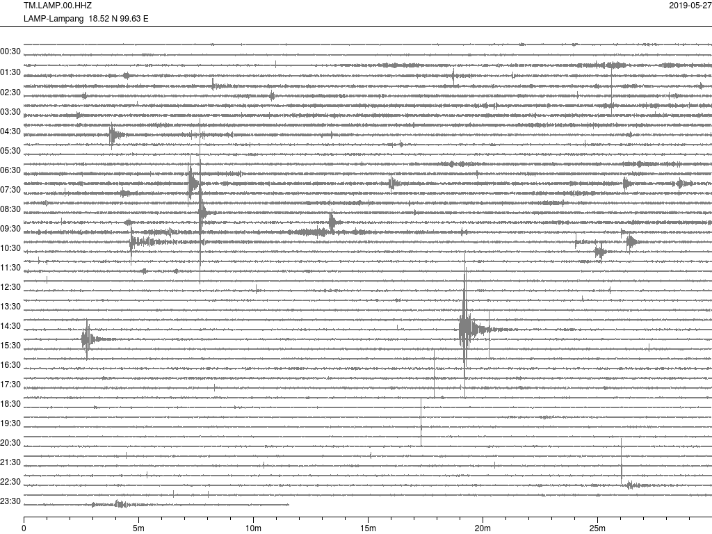 - กราฟแผ่นดินไหวจากสถานีเขื่อนกิ่วลม จ.ลำปาง (LAMP) ของสำนักเฝ้าระวังฯ กรมอุตุฯ จากเวลา 07:00 เมื่อวานนี้ถึง 07:00 เช้านี้