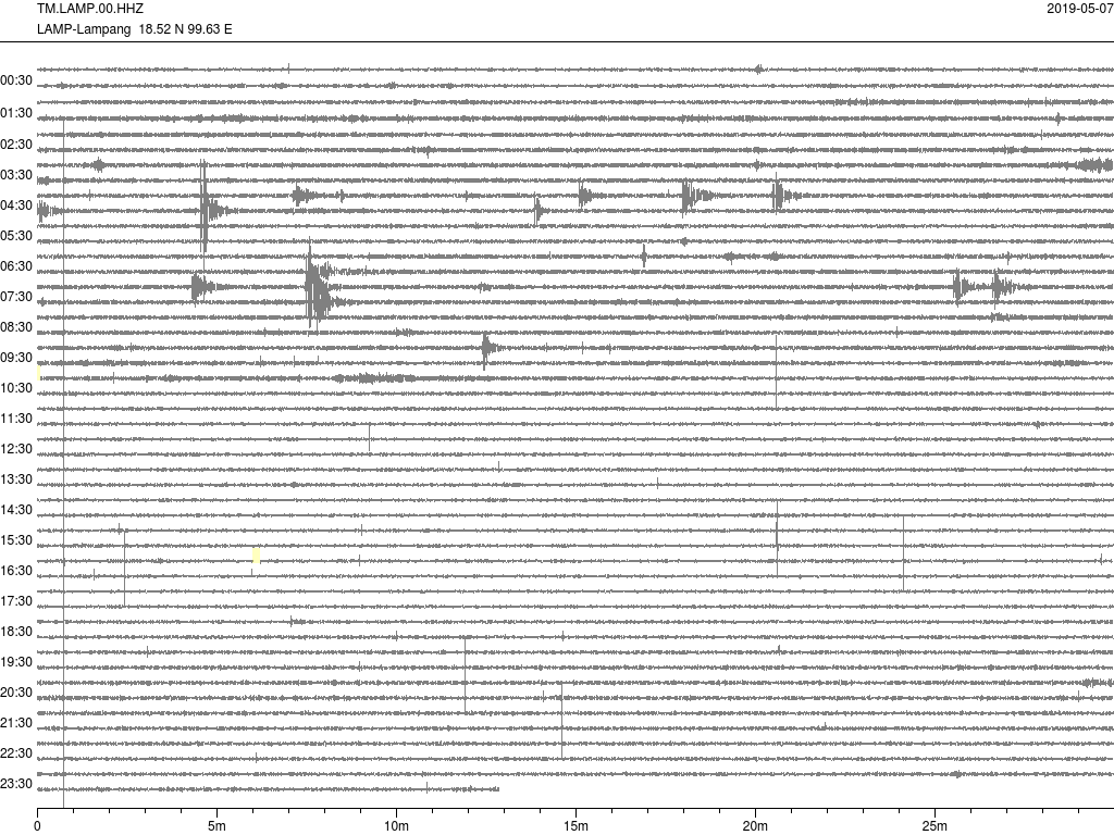 - กราฟแผ่นดินไหวจากสถานีเขื่อนกิ่วลม จ.ลำปาง (LAMP) ของสำนักเฝ้าระวังฯ กรมอุตุฯ จากเวลา 07:00 เมื่อวานนี้ถึง 07:00 เช้านี้