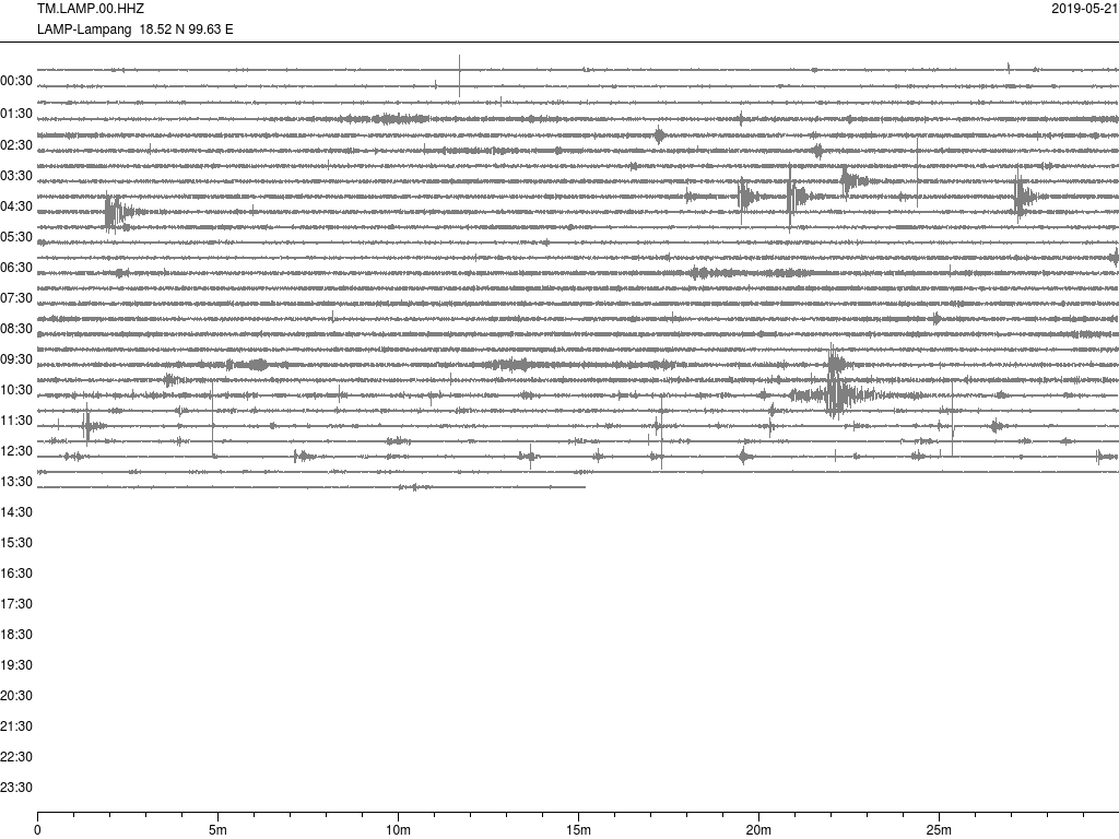 - กราฟแผ่นดินไหวจากสถานีเขื่อนกิ่วลม จ.ลำปาง (LAMP) ของสำนักเฝ้าระวังฯ กรมอุตุฯ จากเวลา 07:00 เมื่อวานนี้ถึง 07:00 เช้านี้