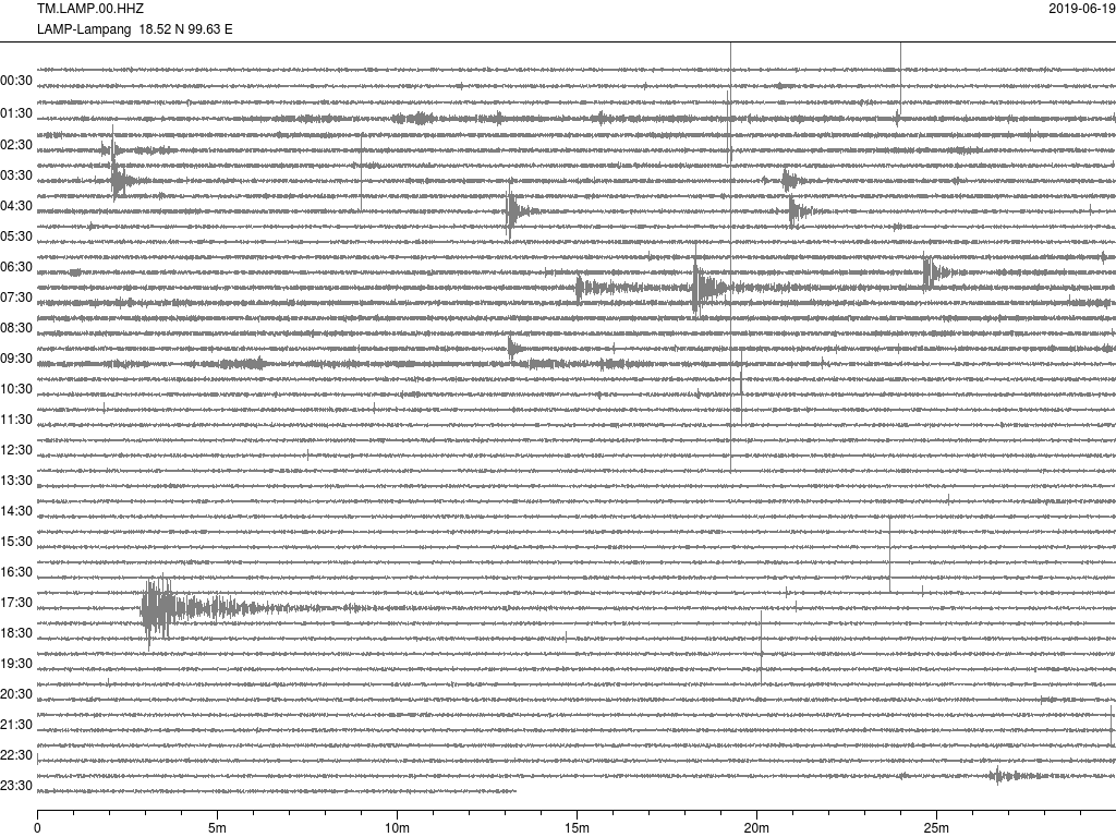 - กราฟแผ่นดินไหวจากสถานีเขื่อนกิ่วลม จ.ลำปาง (LAMP) ของสำนักเฝ้าระวังฯ กรมอุตุฯ จากเวลา 07:00 เมื่อวานนี้ถึง 07:00 เช้านี้