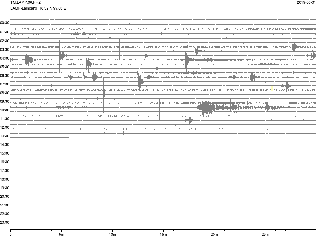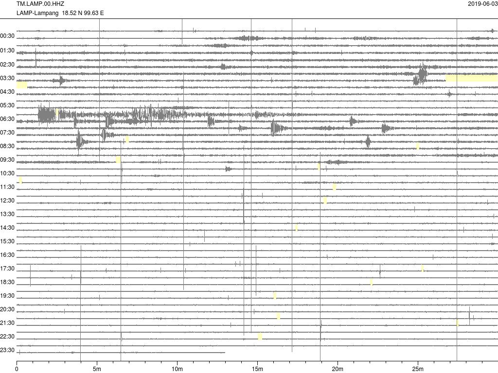- กราฟแผ่นดินไหวจากสถานีเขื่อนกิ่วลม จ.ลำปาง (LAMP) ของสำนักเฝ้าระวังฯ กรมอุตุฯ จากเวลา 07:00 เมื่อวานนี้ถึง 07:00 เช้านี้