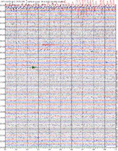 - 06:59 กราฟแผ่นดินไหวชนิดที่ใช้ดูเวลาเกิดเหตุเป็นหลัก แสดงภาพตามแนวตั้ง (BHZ) จากสถานีเครือข่าย IRIS สาขาเชียงใหม่ (CHTO) จาก 07:00 เช้าเมื่อวานนี้จนถึงเวลานี้ เส้นกราฟตามแนวนอนเส้นละ 10 นาที แยกสีเส้นกราฟเพื่อให้ดูได้ง่าย ช่องแบ่งตามแนวตั้งช่องละ 1 นาที