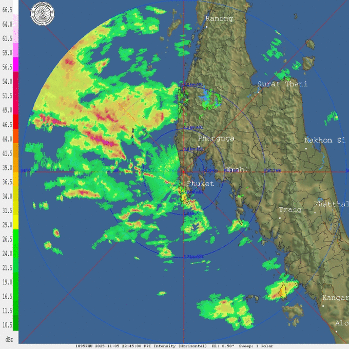 - 07:00 เรดาร์ฝน TMD ภูเก็ต (แบบเคลื่อนไหว) แสดงกลุ่มฝนที่ตกใน จังหวัดภูเก็ตและจังหวัดใกล้เคียง ตลอด 1 ชั่วโมง 15 นาที ที่ผ่านมา